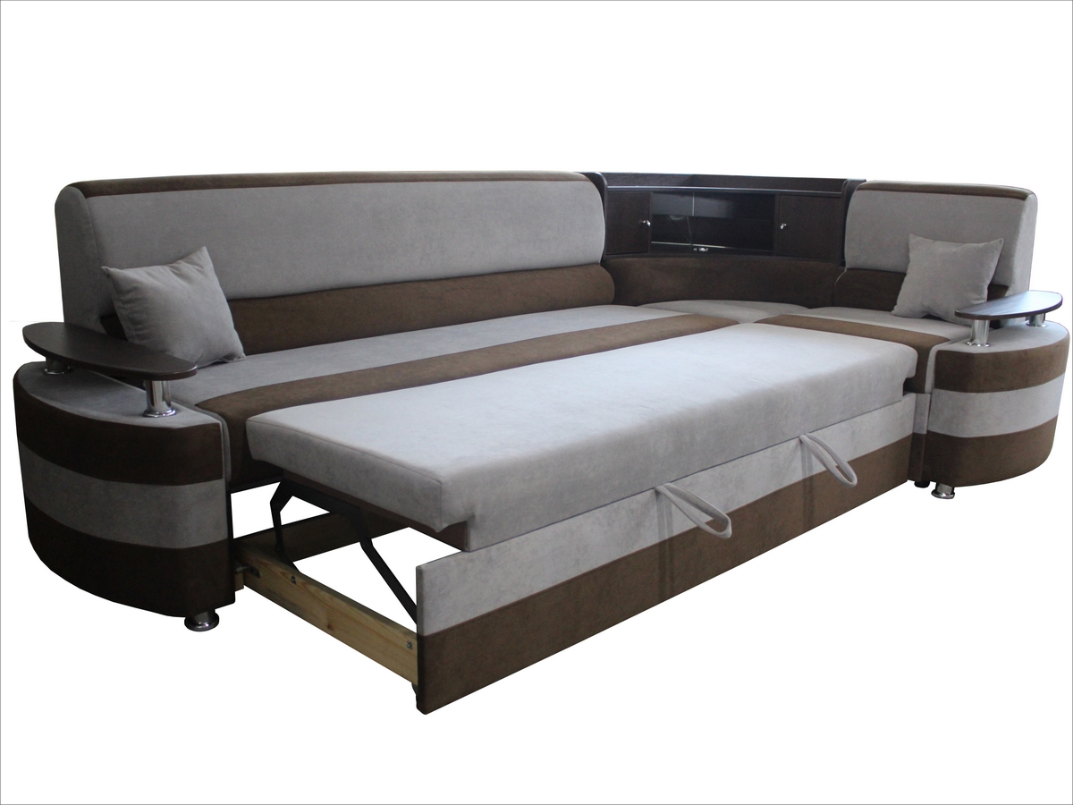 Конструкция предусматривает прочный каркас, часто используется в угловых моделях. Надёжный стальной механизм, направляющие из твёрдых пород древесины позволяют с лёгкостью разложить диван.