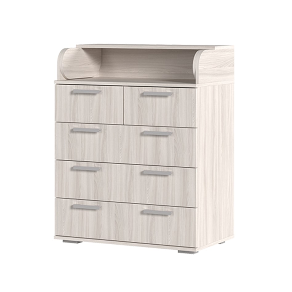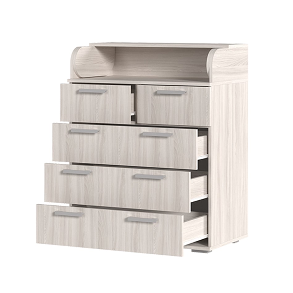 Комод раскладывается путем откидывания верхней крышки.При желании всю верхнюю откидную конструкцию можно снять, получится обычный комод с ящиками.