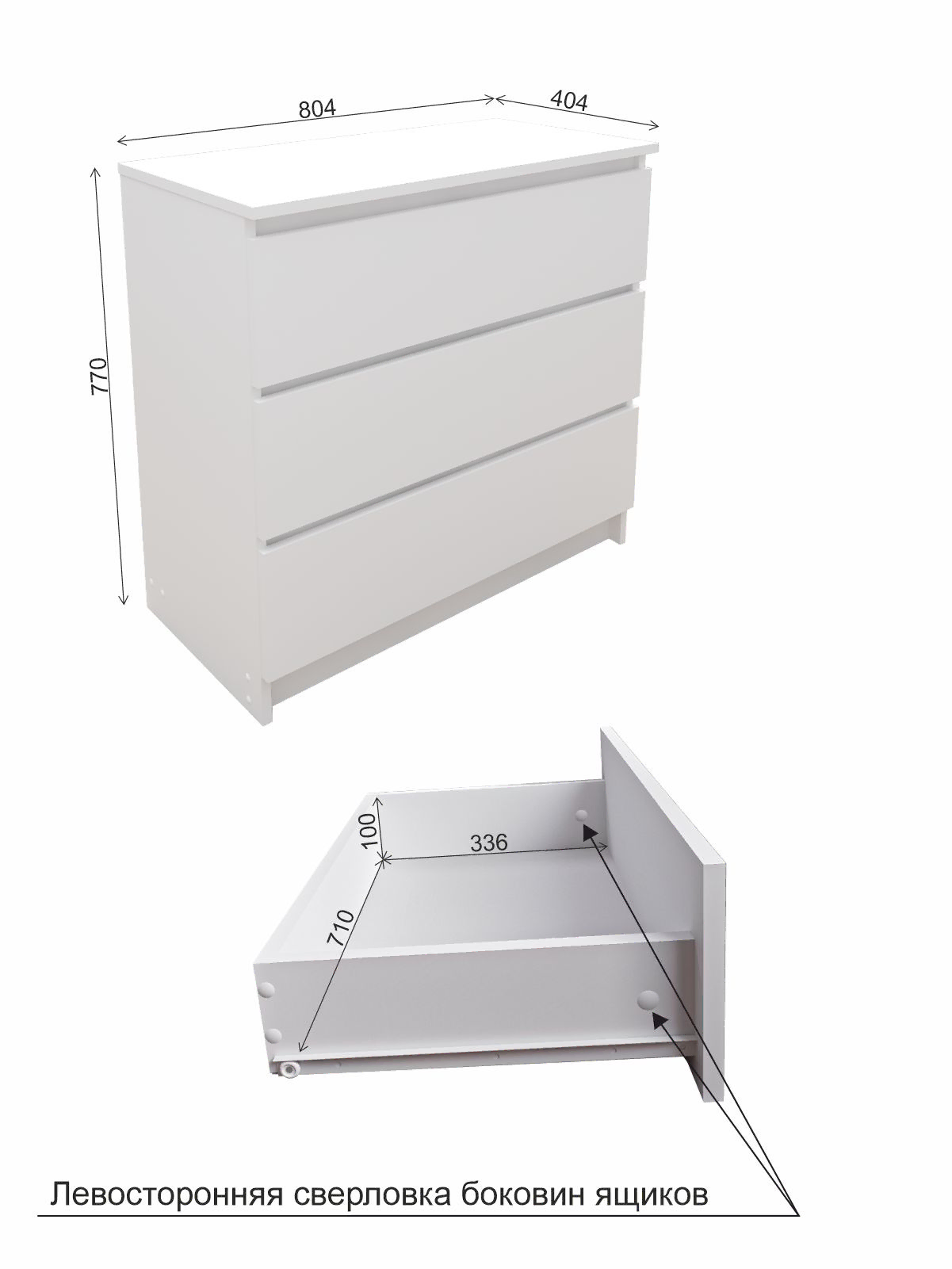 - Особенности: Левосторонняя сверловка боковин ящиков (как на схеме в фото)