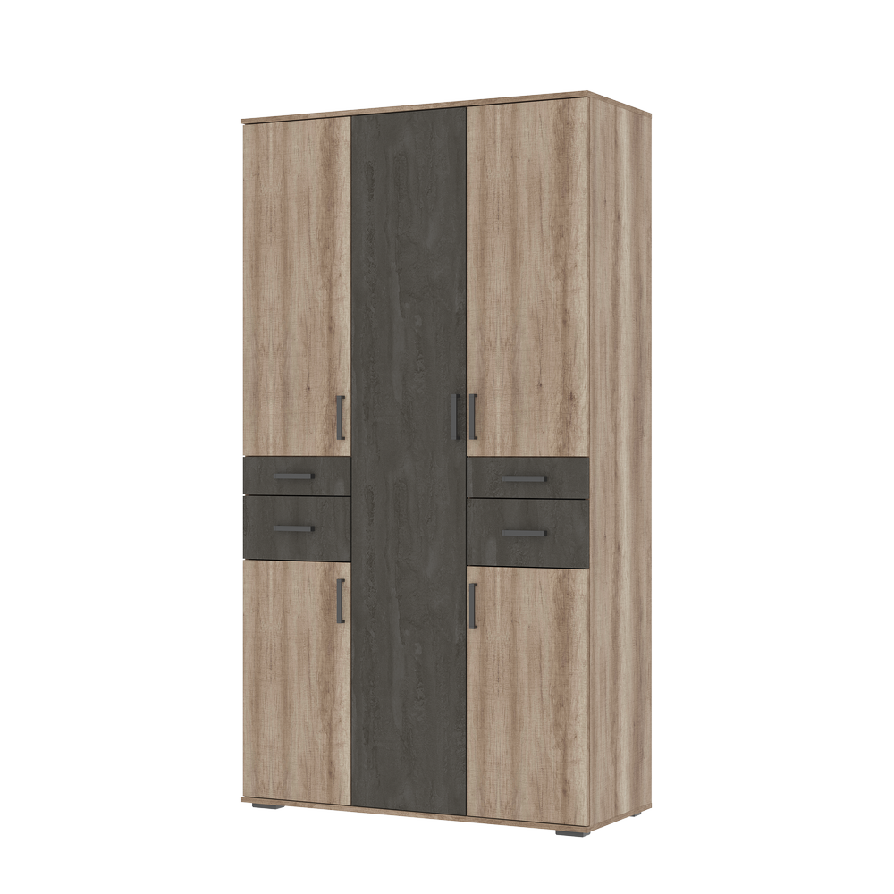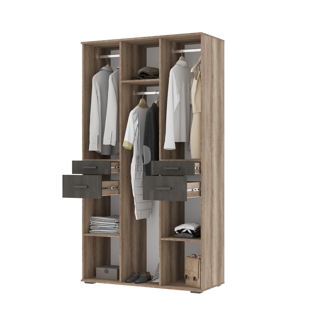 Уникальный конструктив и нестандартный подход к организации вещей. За боковыми верхними распашными створками расположены штанги для хранения одежды малой длины.
