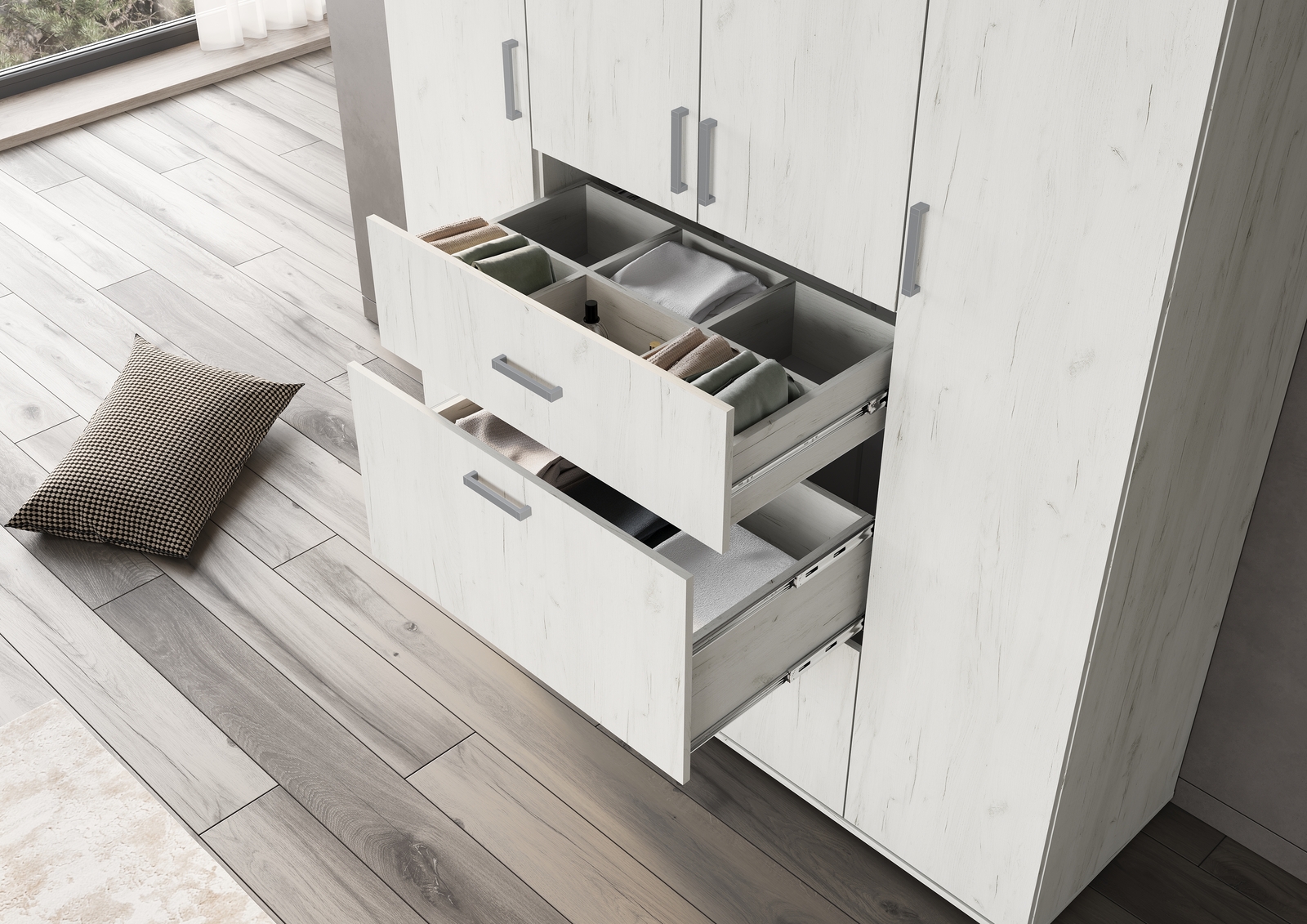 Шкаф интересен уникальными крупногабаритными ящиками с фасадами из ЛДСП на шариковых полновыкатных направляющих.