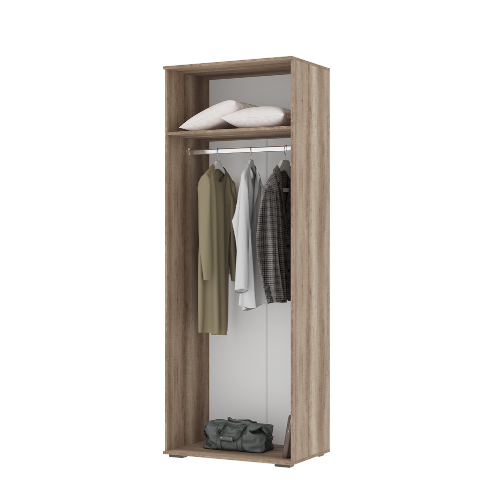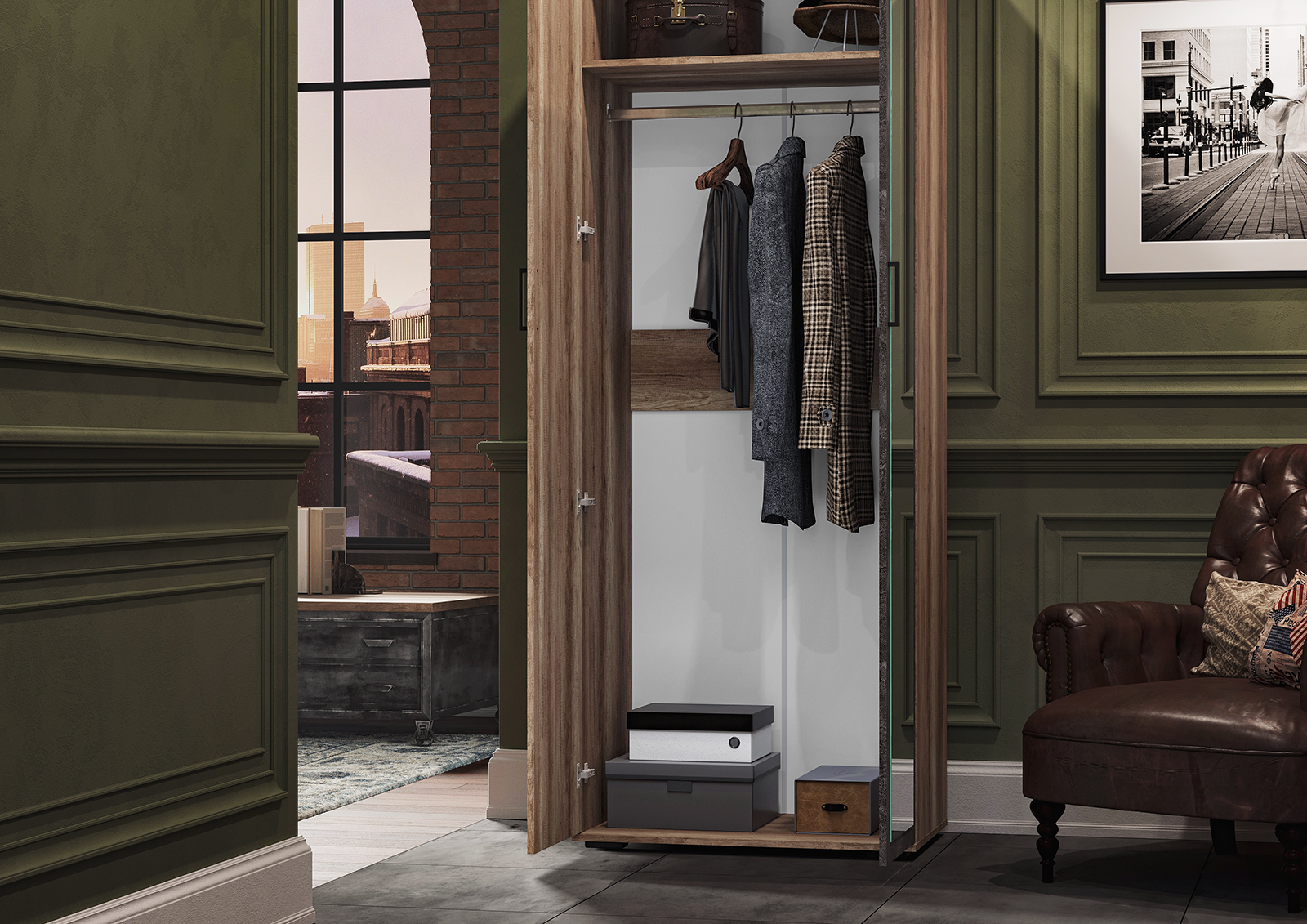 Полка внутри и хромированная штанга позволят компактно разместить одежду.