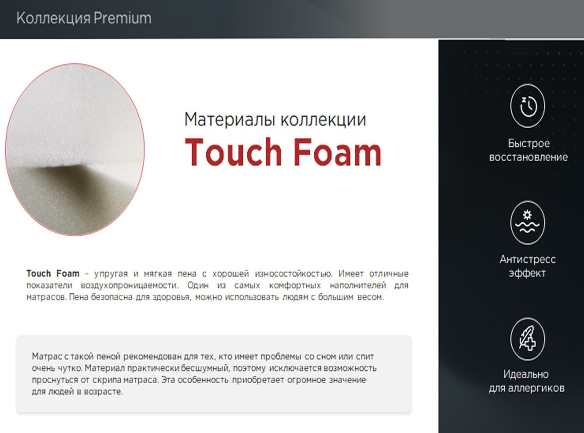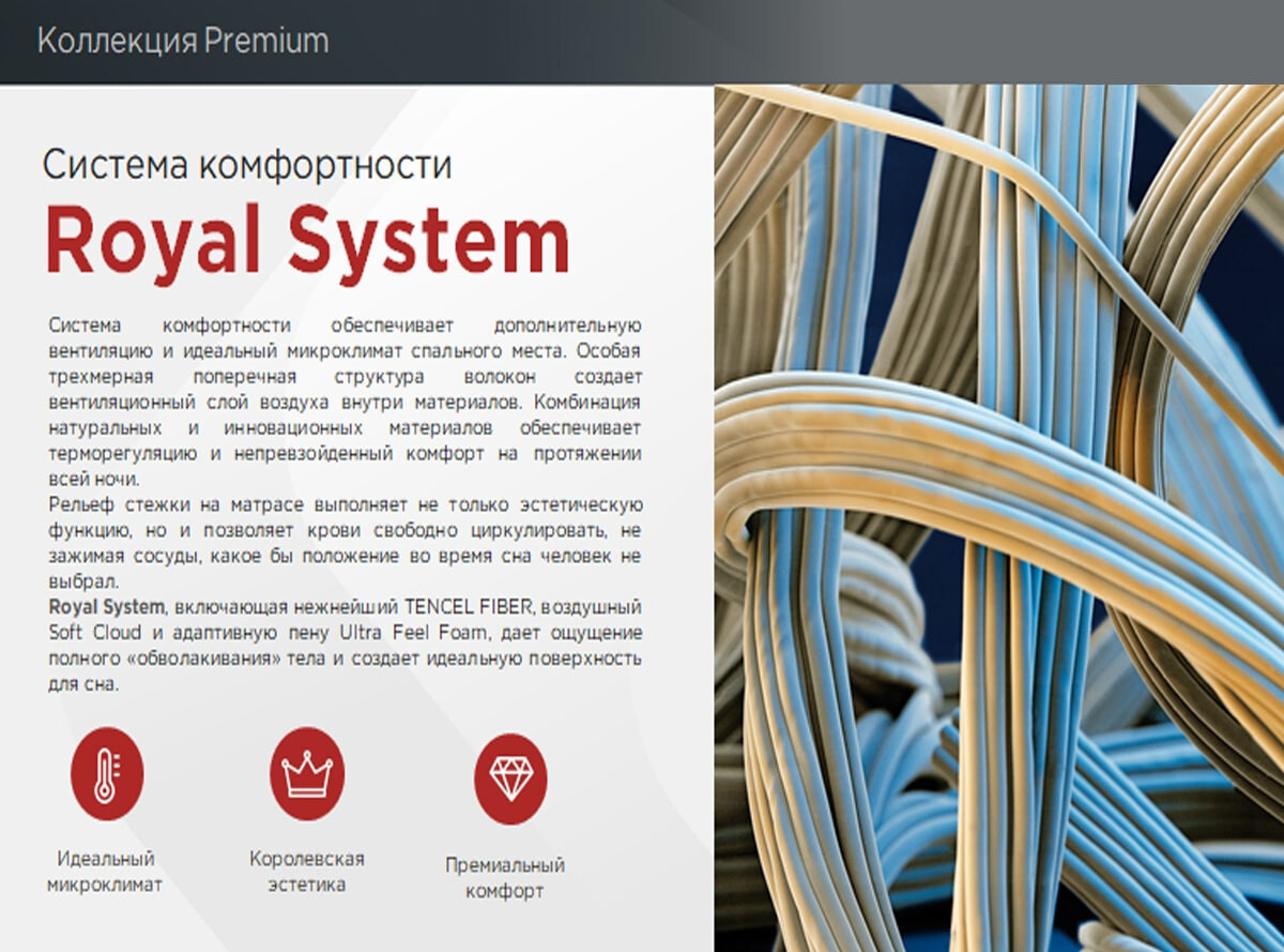 Чехол из высокообъемного трикотажа с Soft Cloud, стёганый на эластичной пене Ultra Feel Foam, Эластичная пена Ultra Feel Foam, Хлопковый войлок, 12-ти зональный блок независимых пружин Royal Support 12 zones, Экологически чистый войлок, Упругая пена Touch Foam, Усиление по периметру, Бурлет из приятного вельвета