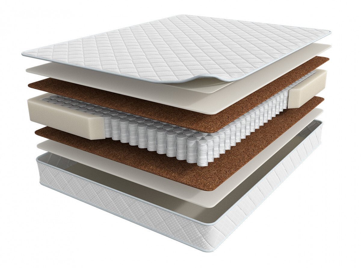 Трикотаж, стеганый на синтепоне, высокоэластичная пена, кокосовое волокно, блок независимых пружин повышенной надежности, усиление по периметру из ППУ