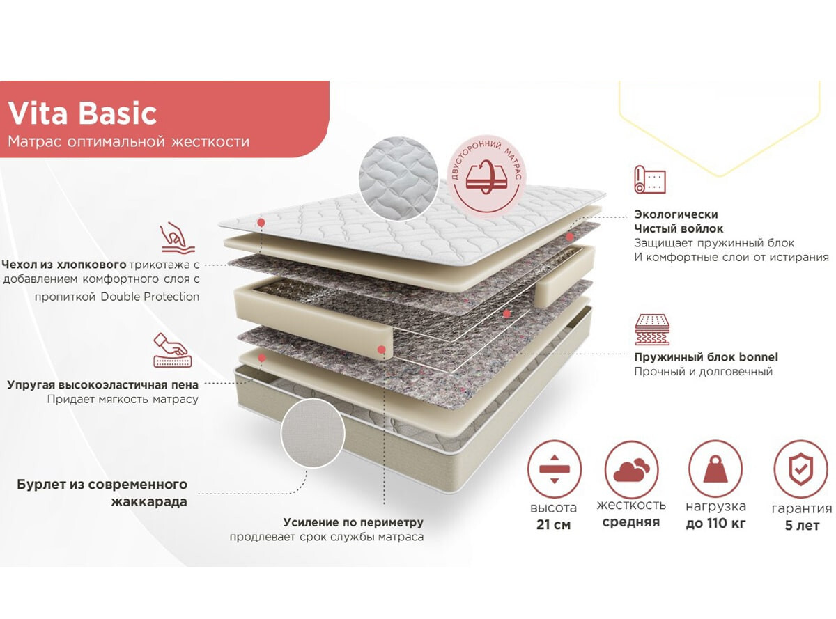 Состав матраса Vita Basic:- Чехол из хлопкового трикотажа с добавлением комфортного слоя с пропиткой Double Protection