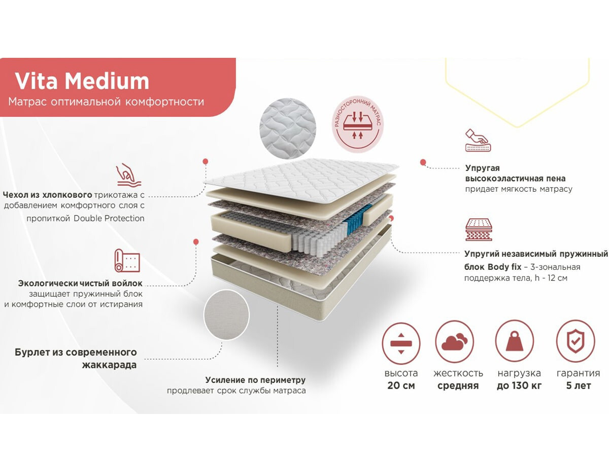 Состав матраса Vita Medium:- Чехол из хлопкового трикотажа с добавлением комфортного слоя с пропиткой Double Protection